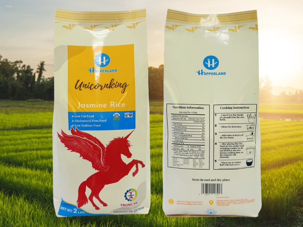 Gạo xuất khẩu Unicornking Jasmine Rice – một trong những loại gạo thơm ngon được ưa chuộng nhất hiện nay. Hạt gạo ngắn, trắng, ít bạc bụng; khi nấu chín tỏa hương thơm dịu, cơm mềm dẻo, phù hợp cho mọi lứa tuổi.