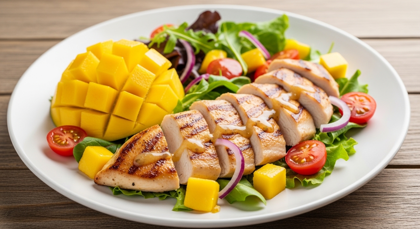 Salad xoài kiểu Âu: kết hợp xoài chín, phô mai và rau món ăn mang hơi thở toàn cầu nhưng vẫn lưu giữ hương vị Đồng Tháp.