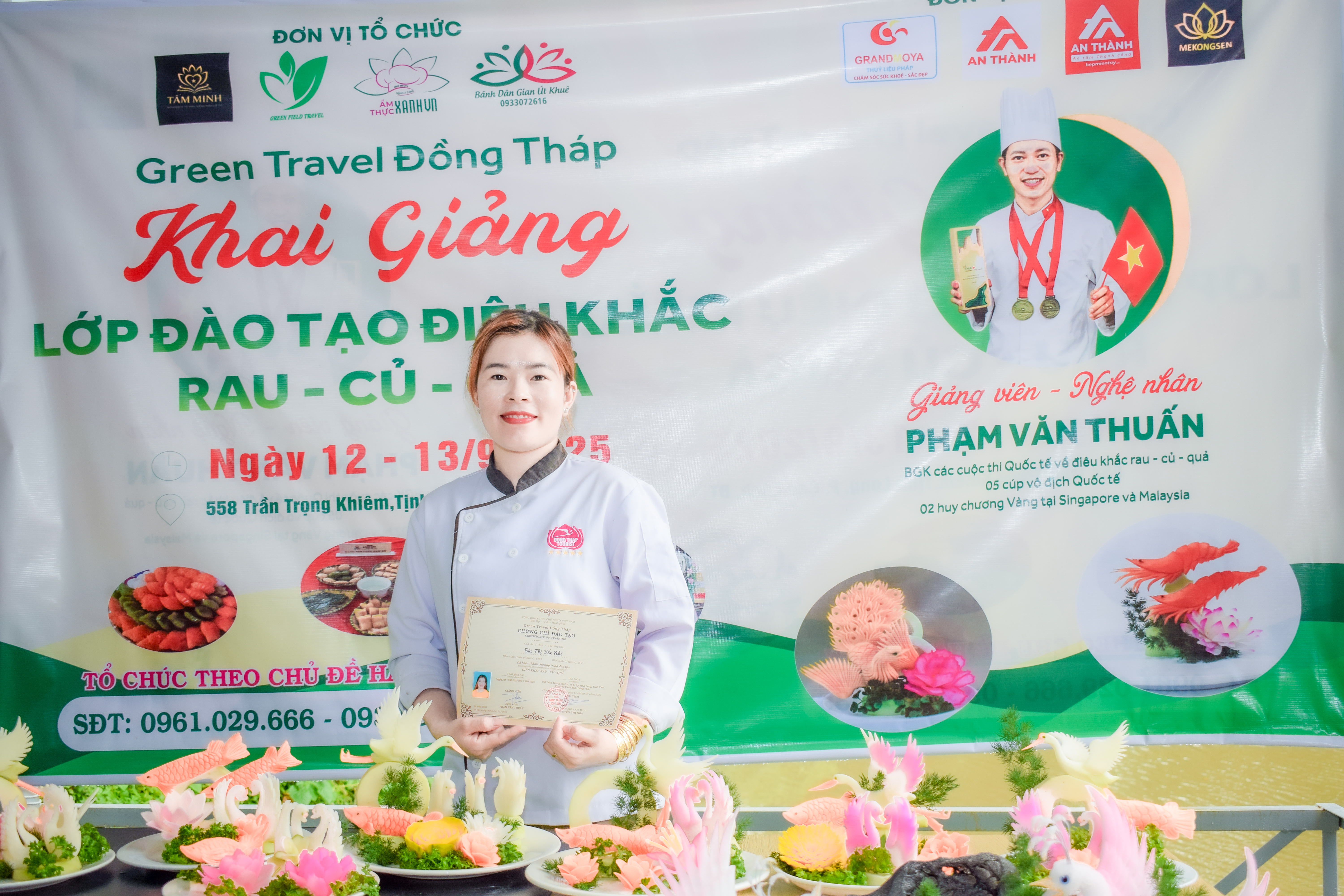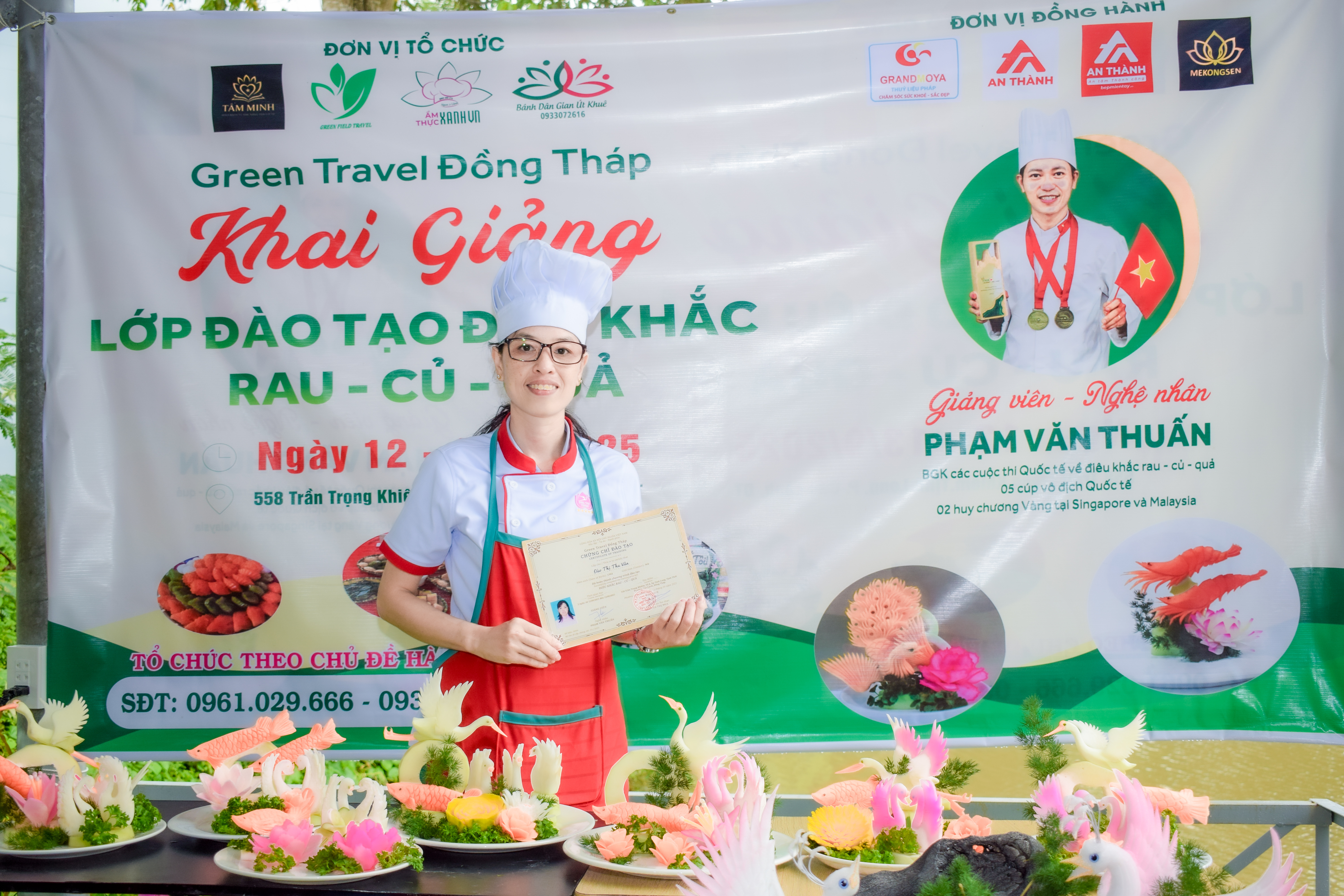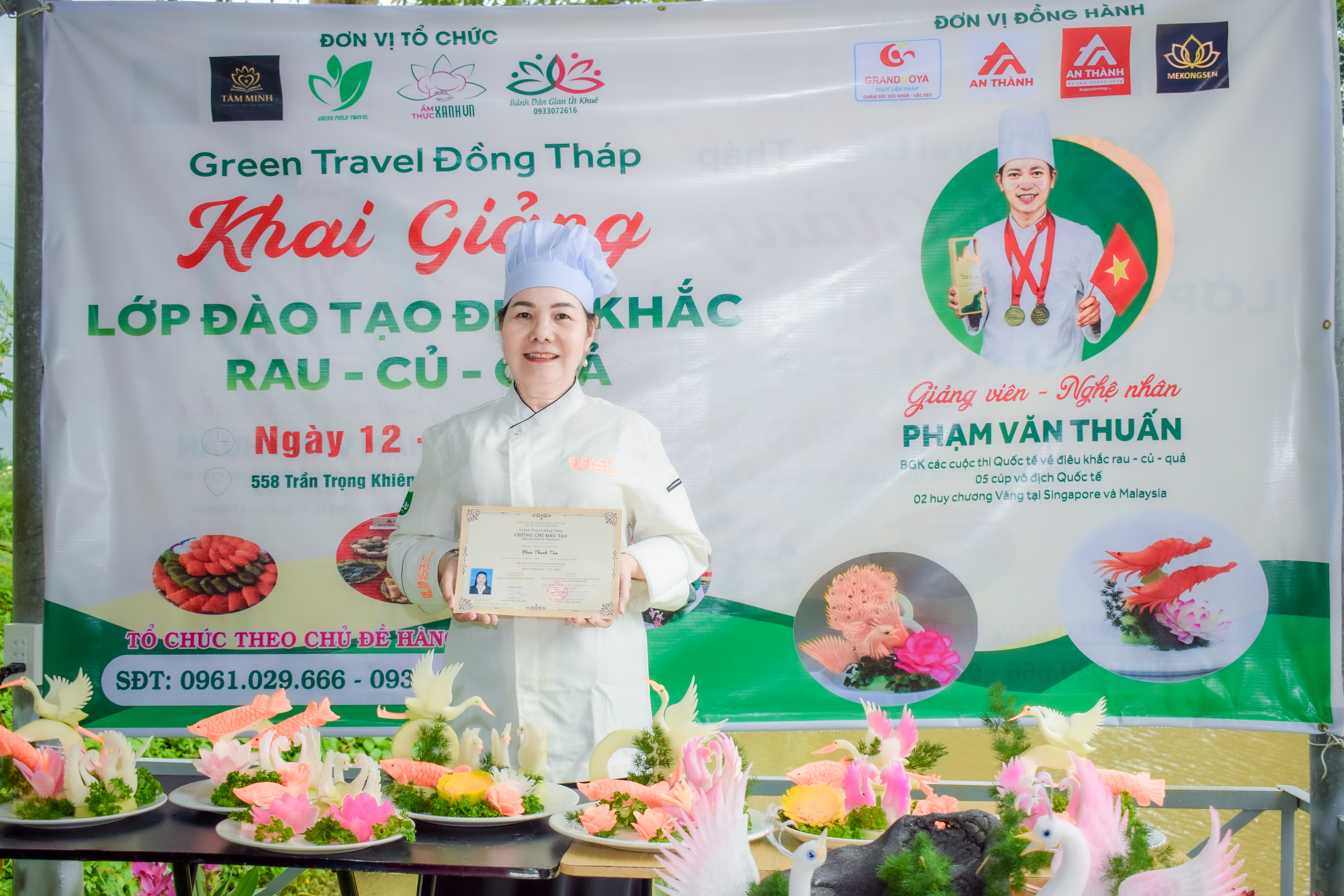 Chiều ngày 13/09, tại Khu Du lịch Vườn dừa Út Khuê - 558 Trần Trọng Khiêm, Tịnh Long, Phường Cao Lãnh, Đồng Tháp, buổi bế giảng lớp đào tạo Điêu khắc Rau – Củ – Quả do Green Travel Đồng Tháp tổ chức đã diễn ra trong bầu không khí ấm áp, đầy tự hào. Sau 4 buổi học ngắn ngủi, nhưng trọn vẹn sự hăng say và nỗ lực, toàn bộ học viên đều gặt hái được thành quả ngọt ngào.