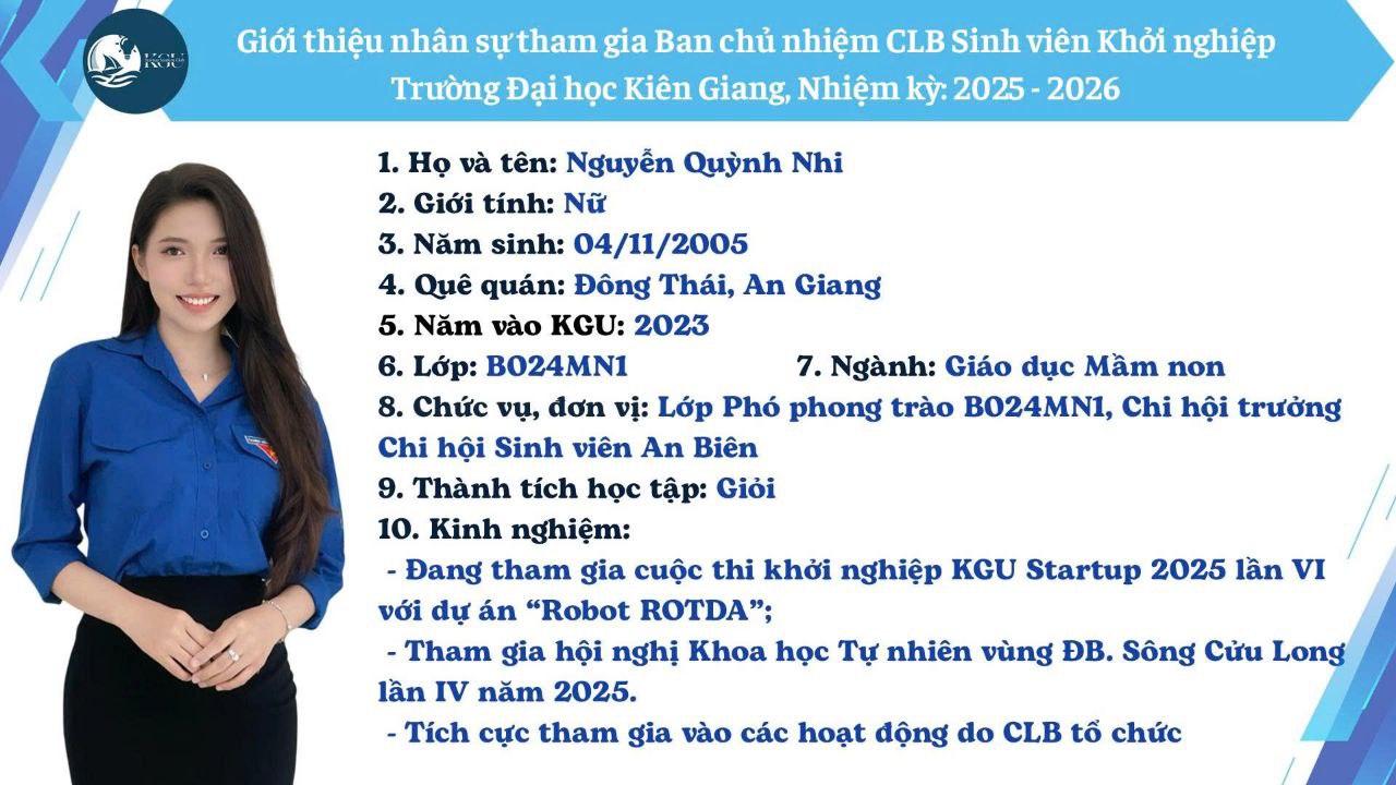 Sự kiện khép lại trong không khí ấm áp với phần chúc mừng sinh nhật lần thứ 3 của Câu lạc bộ, đánh dấu một hành trình trưởng thành đầy tự hào. Việc đồng hành cùng chương trình tiếp tục thể hiện định hướng kết nối – hỗ trợ – phát triển thế hệ trẻ của Hiền Nhân Group. Chúc CLB Sinh viên Khởi nghiệp KGU ngày càng lớn mạnh, trở thành nguồn cảm hứng cho sinh viên Kiên Giang trên con đường học tập, đổi mới sáng tạo và hiện thực hóa khát vọng khởi nghiệp.