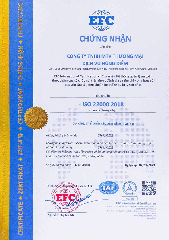 Đây chính là minh chứng cho cam kết của Yến Sào Hùng Diễm KG trong việc mang đến sản phẩm an toàn – chất lượng – vươn tầm thế giới.