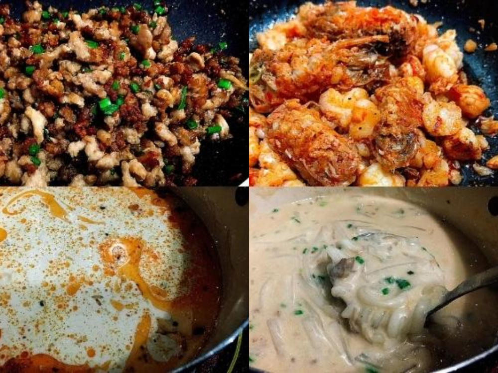 - Tiếp theo bạn cho thịt và tôm vào xào cho săn lại