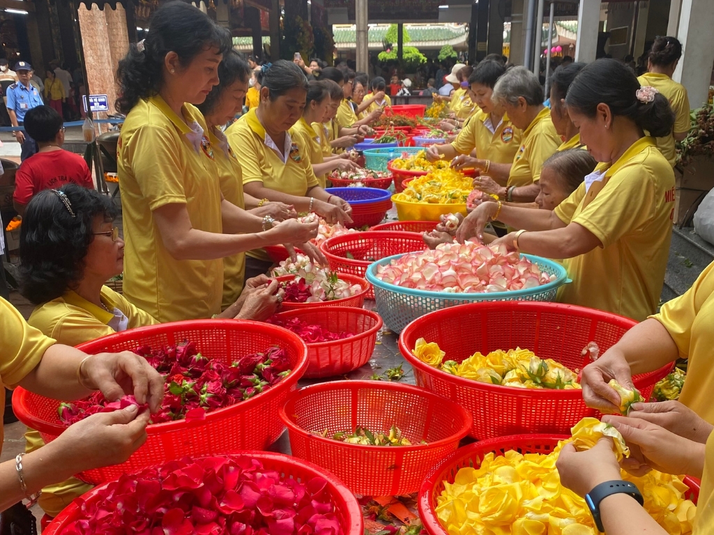 Lễ nấu nước tắm Bà năm nay tổ chức tại khuôn viên Miếu Bà Chúa xứ Núi Sam kéo dài từ lúc 9 giờ đến 17 giờ. Từ sáng sớm, các thành viên, hội viên nữ Hội Quý Tế – Ban Quản Trị Lăng Miếu Núi Sam (Miếu Bà Chúa Xứ Châu Đốc) đã tiến hành chọn những bông hoa đẹp, tươi để làm nguyên liệu nấu nước tắm Bà;